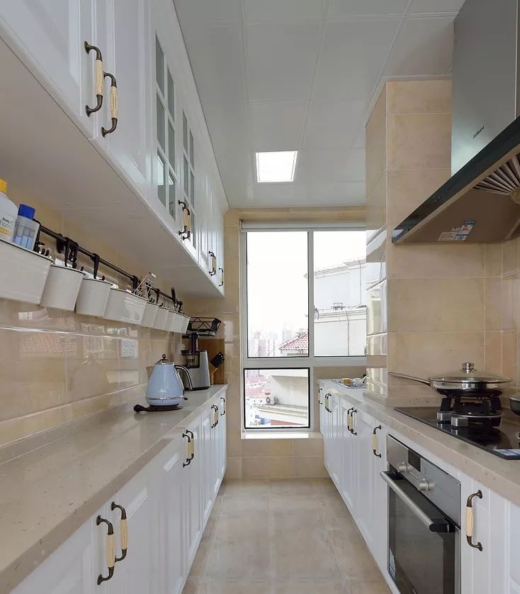 二字型櫥柜的特點是在廚房里用過道把烹飪和收納完美分開,靠墻的兩側(cè)作為灶臺或者操作臺,合理的分布設(shè)計也能提高在廚房的工作效率和安全度??臻g結(jié)構(gòu)上,沒有一絲的浪費,整齊實用。