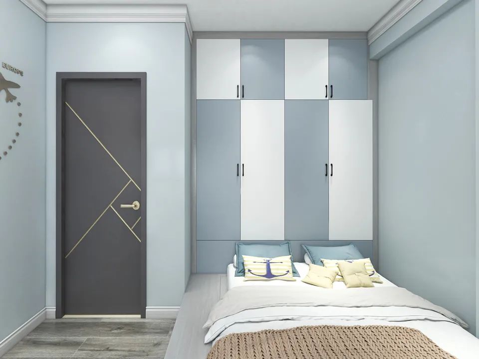 對(duì)于兒童房來說,可以選擇一些亮麗、清新的色彩作為衣柜門,比如藍(lán)色、綠色等,搭配卡通范的壁紙、墻貼,更有活力。