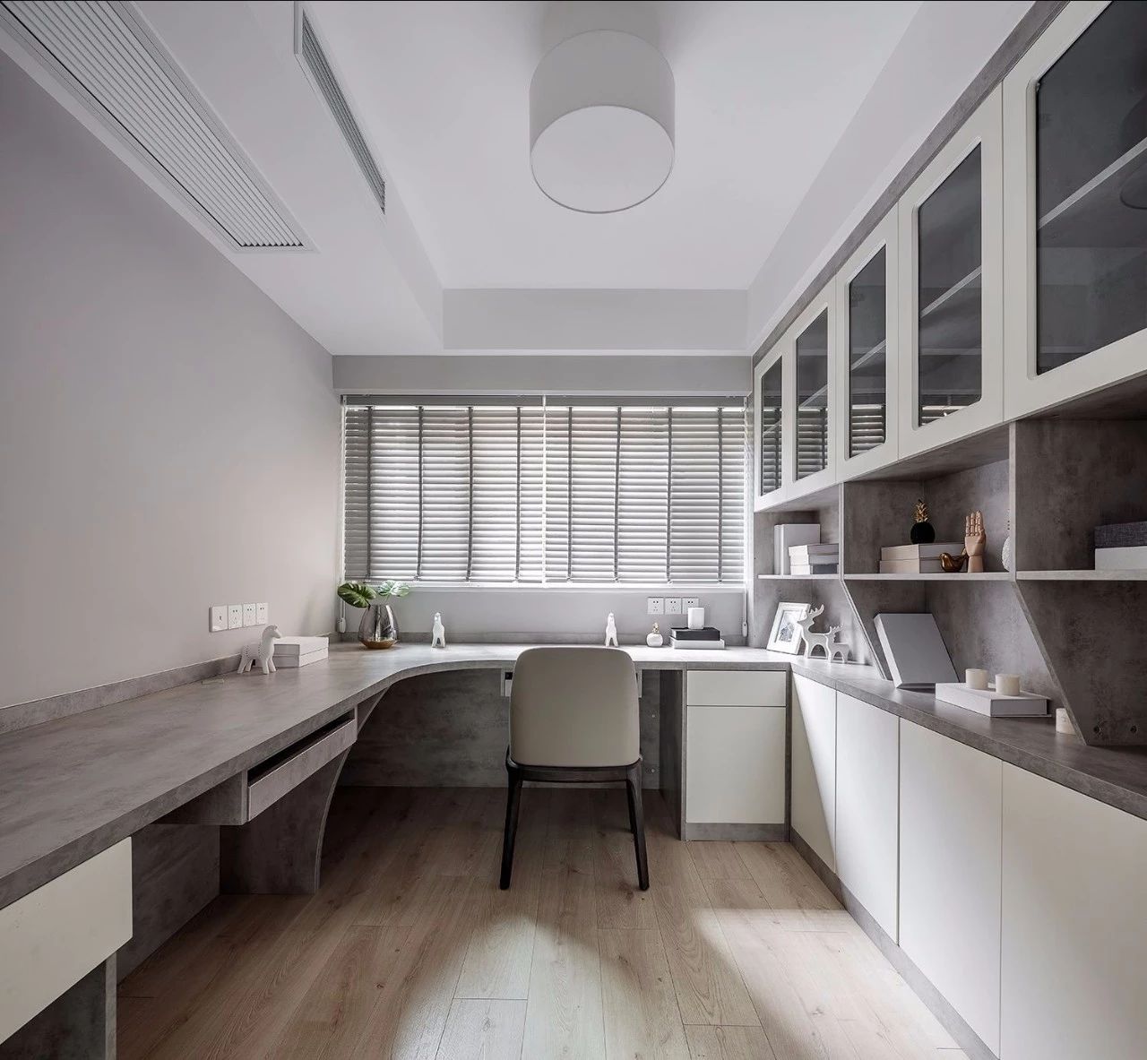 書桌和柜子的搭配非常關(guān)鍵,書桌的上方做玻璃柜,周邊也做儲物柜,這樣書房才能擁有更多的儲物空間,即使不工作的時候,也非常實用。