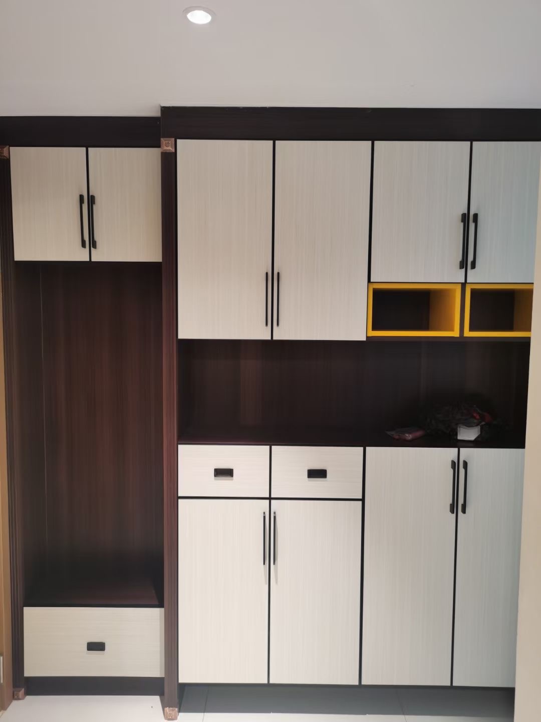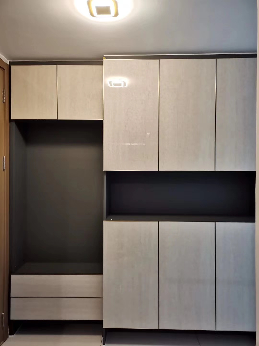 把玄關(guān)處的鞋柜換成翻轉(zhuǎn)式或者按壓式,會比抽屜和柜門方便很多。