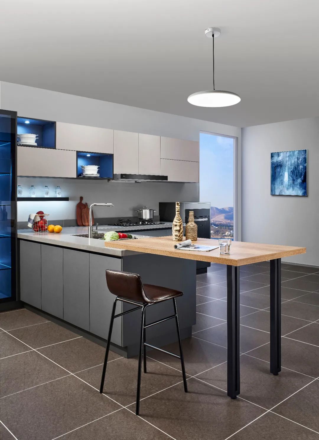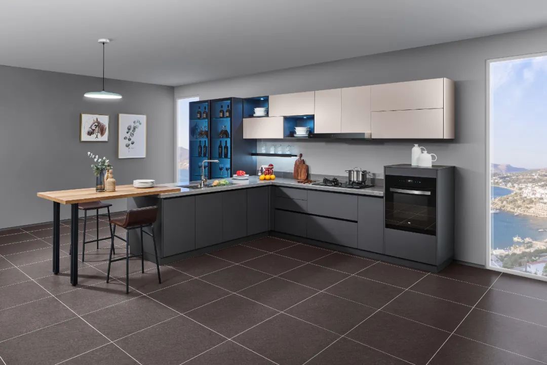 鋁師傅櫥柜,線條利落有致,格局清晰分明,開放式設(shè)計(jì)可以增強(qiáng)家庭成員間的互動(dòng),延展式木質(zhì)吧臺(tái)的嵌入,將自然元素與都市線條和諧過度,中高柜與嵌入式廚電相得益彰,強(qiáng)化空間的收納功能。